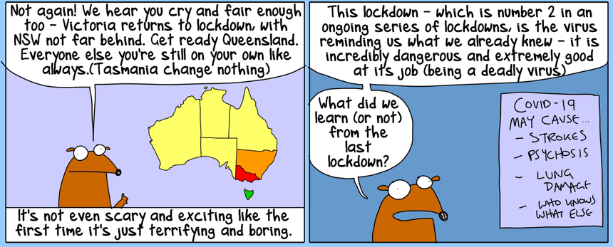 In any case, First Dog on the Moon has advice for Australians in their second lockdown that could be helpful for Americans, or at least it could be if we attacked it with science instead of attempting to lobby it out of existence with stubborn politics.