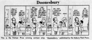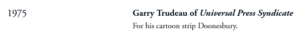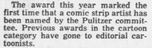 Or saying it was the first time anyone other than an editorial page cartoonist had been chosen (though fairly quickly many newspapers began shifting Doonesbury from the funny pages to the opinion pages).