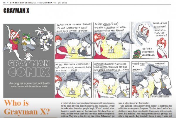 Grayman Comix by Lori Smith first appeared the November 16-29, 2022 issue of Street Sense. The comic shares its space with the Weingartens and Clark (w/ LaBadie) strip Barney & Clyde, when that comic features a homeless issue in its Sunday edition.