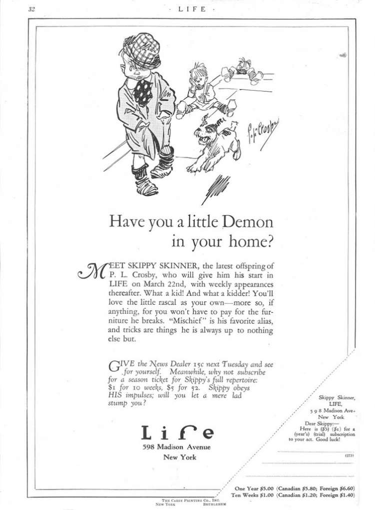In the March 15, 1923 issue of Life Skippy made his first appearance in a full page announcement and ad.