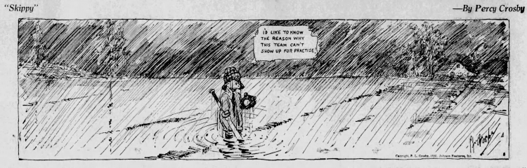 Cartoonist Percy Crosby has long been acknowledged as one of the great early cartoonists, both for his precision draftsmanship and as the first cartoonist to place philosophical ideas into the mouths of children. Crosby’s “Skippy” was, of course, a major inspiration for Charles Schulz’s “Peanuts.” But Crosby’s life before and after “Skippy” was remarkable, as I’ve learned from Jared Gardner’s introduction to Percy Crosby’s Skippy Volume 1: Complete Dailies 1925-1927, edited by Gardner and Dean Mullaney