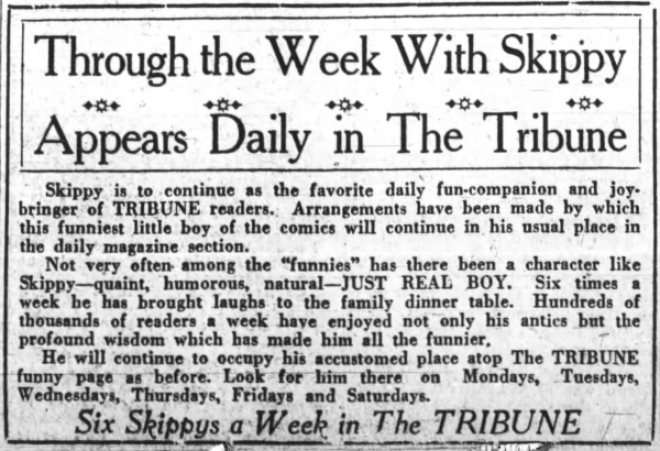On June 22, 1925 Skippy debuted as a daily syndicated newspaper comic strip, a Sunday page was added on October 17, 1926. (GoComics has been running the daily strip from the beginning since 1912.)