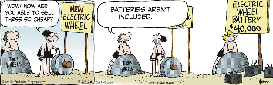 A couple of guys at the dog park have them and their conversation seems to center around frequent maintenance and, in particular, batteries that don’t hold the charge promised and, as in the cartoon, cost about as much as the whole bike.