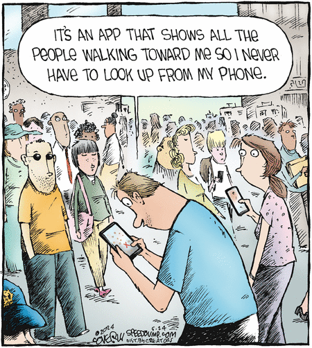 When cell phones first became a thing, I often saw on-line videos of people staring at their phones and walking into lampposts or falling into fountains. Either we’ve gotten better at watching our paths or we’ve lost our sense of wonder over such pratfalls.
