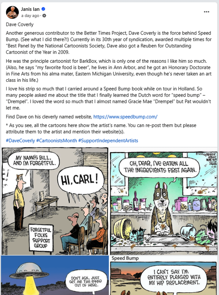 Janis Ian has been profiling cartoonists throughout this month on her Facebook page, and while I’ve seen some of my favorites featured, I’ve also discovered some new ones. You should scroll through and see what you find, and remember her instructions to always attach the artist’s name and include a link to their site.