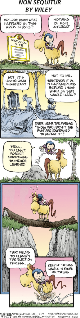 We’re not doing political cartoons today, but let’s start with something blatantly political: This past Sunday’s Non Sequitur (AMS).