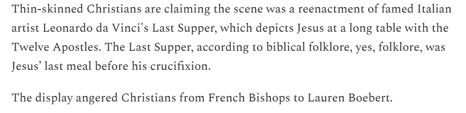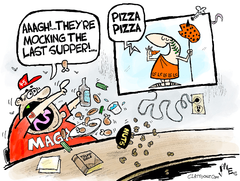 Clay Jones satirizes the off-the-wall outrage of Christian bluenoses to the Dionysian float at the opening of the Paris Olympics, suggesting that such people might find offense not only in depictions of Greek mythology but also in Roman pizza.
