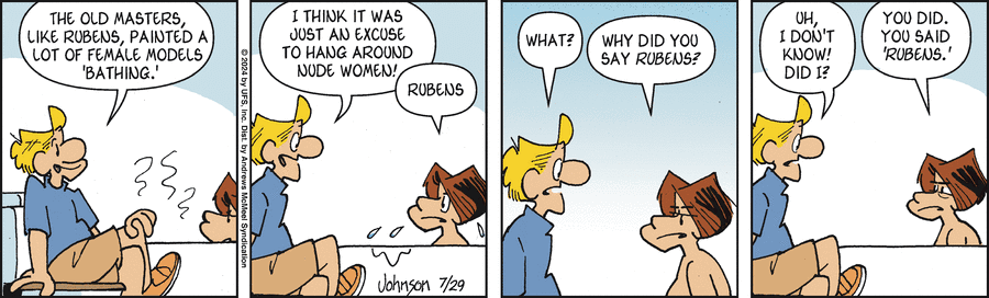 This Arlo & Janis (AMS) is neither satire nor parody but Jimmy Johnson offers a sort of homage, given that Arlo clearly admires Rubens and considers the comparison a compliment, the joke being that Janis is well aware that “Rubenesque” is a euphemism for “fat.” Their husband-and-wife discussion continues in their current arc.