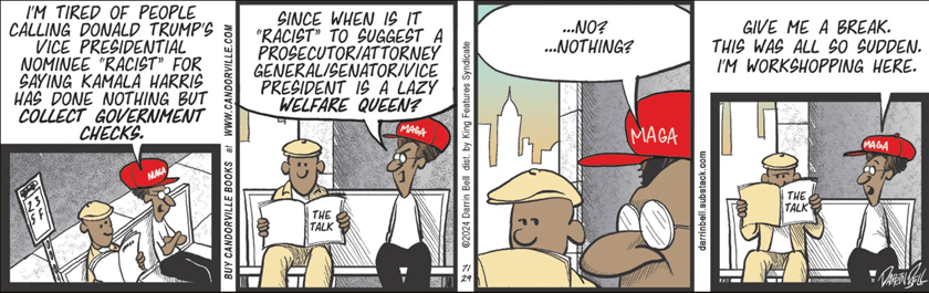 This Candorville (KFS) is satire. Darrin Bell is satirizing MAGAts in how they attack Kamala Harris and, as seen in the final panel, for the desperation with which they have had to shift strategies following Biden’s withdrawal and Harris’s promotion to lead candidate.