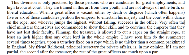Like Swift, he doesn’t admit the satire. That would ruin the effect, just as, in Gulliver’s Travels, Swift has his hero and narrator describe Lilliputian political ambitions without suggesting that tightrope walking was a satire of anything in England: