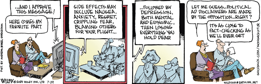 By contrast, while Wiley’s intent in this Non Sequitur (AMS) is satirical, he frames the comic as a parody of drug commercials, swapping out physical side effects for political side effects.