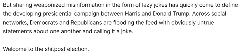 It’s definitely coming from both sides: While the left giggles over couch jokes, Elon Musk prohibited fake videos on Twitter and then posted a fake video that attacks Kamala Harris, whom he hopes to see defeated in November, later declaring it satire, having first posted it simply as “amazing.”