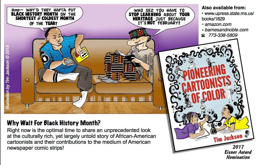 Comics community–I am very sorry to report that the cartoonist Tim Jackson has passed away. Tim, cartoonist for the Chicago Defender as well as many other venues, and the author of the invaluable Pioneering Cartoonists of Color, was kind and always generous with his time. He was devoted to making sure people knew about African American cartoonists.