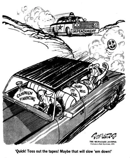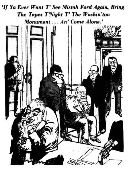 However, there remained the issue of the White House tapes, which were said to reveal Nixon’s conversations with his staff about the Watergate burglary, its cover-up and sundry other corrupt actions. As Wayne Stayskal noted, The Senate threatened to delay confirming Ford unless Nixon gave up his stance about executive privilege and released the tapes.