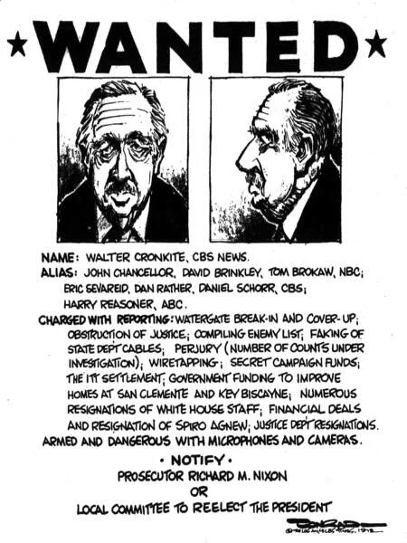 Nixon launched an attack upon the media, and Conrad mocked that as well, listing the offending journalists who had the temerity to report the news. Again, context should be noted: There was no Internet, nor was there a fourth major network promoting favorable partisan alternatives to straight coverage.