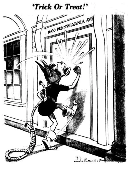 Warren also took advantage of the Halloween season to accuse Democrats of leading a lynch mob against the president, though by the time this cartoon appeared, the Saturday Night Massacre had happened and support for the president was seriously fading.