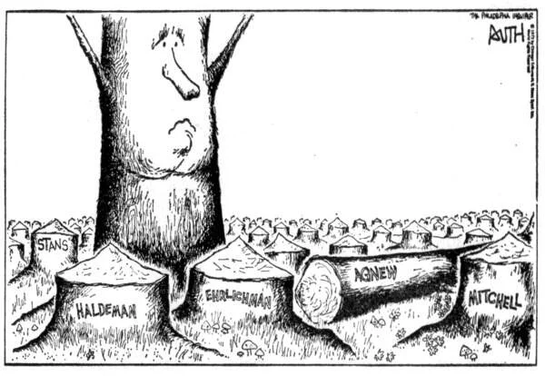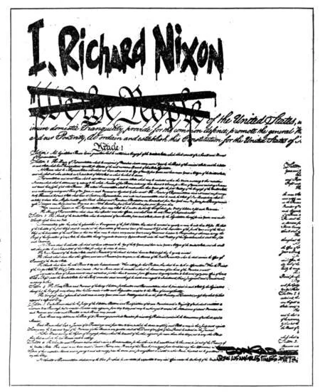 Vice President Spiro Agnew was, as Jeff MacNelly put it, caught with his hand in the cookie jar, having taken kickbacks from corrupt contractors while an official in Baltimore, payments that continued into his time as VP. Although he initially declared that a sitting vice-president could not be indicted, he agreed to step down on October 10.