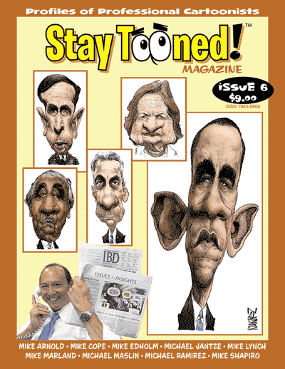 As usual, John Read gives me an advanced sneak peak at his upcoming magazine (pictured above). This issue is dedicated to nine cartoonists whose first name is Mike or Michael. Rumor has it that Mike Lynch (one of the profiled cartoonists) is fond of saying, “you don’t have to be named Mike to make it as a cartoonist, but it don’t hurt!” Other cartoonists include: Mike Arnold, Mike Cope, Mike Edholm, Michael Jantze, Mike Marland, Michael Maslin, Michael Ramirez (who did the cover) and Mike Shapiro.