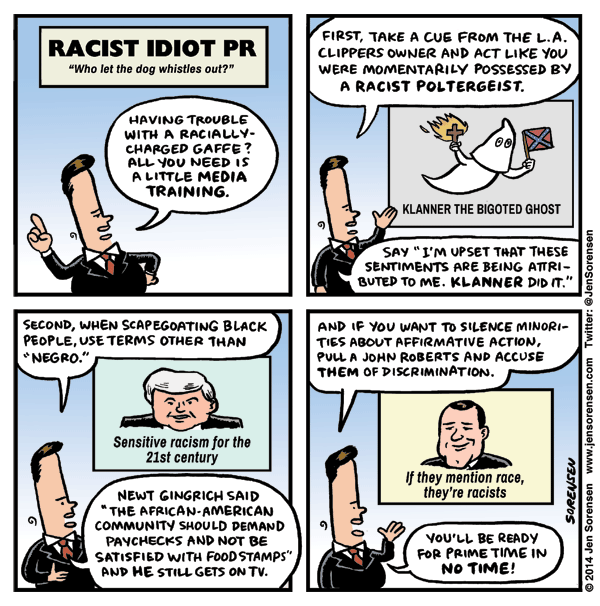 And Jen Sorensen, whose commentary is not only spot-on in addressing the larger issue of emerging racism, but gives me an excuse to announce that she's won yet another award.