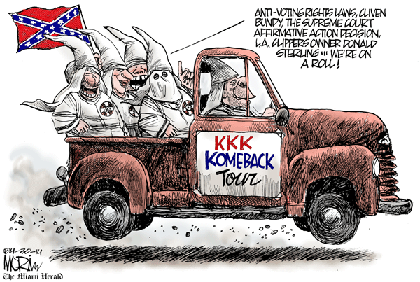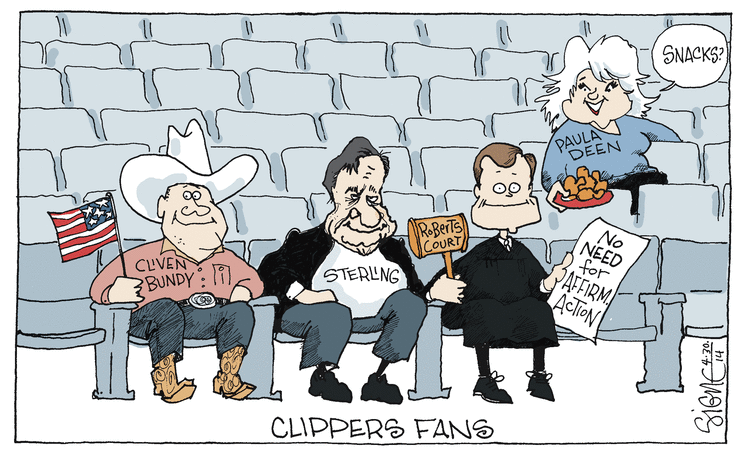 Skip to commentsThe brouhaha over San Diego Clippers owner Donald Sterling took a bad turn for cartoonists yesterday when NBA Commissioner Adam Sterling hit him with a $2.5 million fine (the maximum allowed) and a lifetime ban from the league, meaning that, while they couldn't actually force him to sell the team, they could forbid him to have any interaction with it.