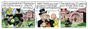 Many cartoonists are lovers of the classic comic strips and occasionally pay homage to them in their own comic strips. Mark Tatulli’s Lio, Stephan Pastis’ Pearls Before Swine, Mike Curtis and Joe Staton’s Dick Tracy, Bill Griffith’s Zippy, and Patrick McDonnell’s Mutis pop into mind as some current examples. But Jim takes it a step further creating entire sequences starring such an abundance of old characters they often overflow the borders.