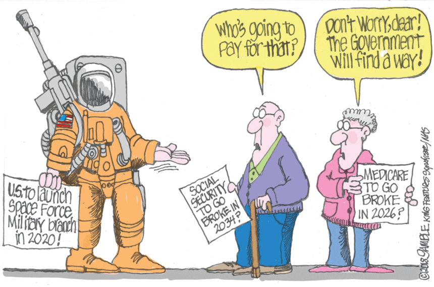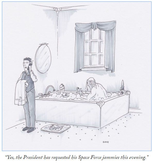 Instead, we get Mike Pence — an unconvincing substitution for Dick Cheney — announcing the Space Force, and John Branch is not the only cartoonist to present the idea in the form of yet one more empty, unfunded, ridiculous distraction.