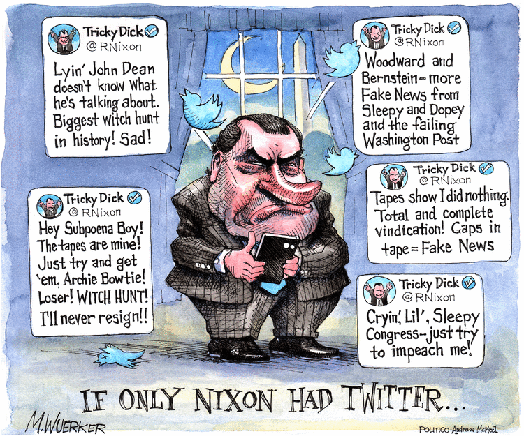 Matt Wuerker shows what Nixon might have been like with his back to the wall, if he had had Dear Leader’s access to modern social media.