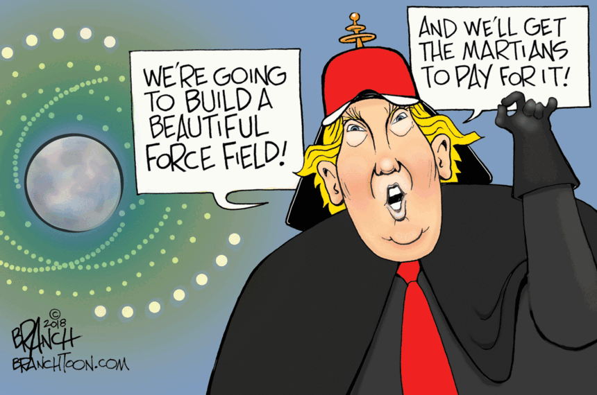 Instead, we get Mike Pence — an unconvincing substitution for Dick Cheney — announcing the Space Force, and John Branch is not the only cartoonist to present the idea in the form of yet one more empty, unfunded, ridiculous distraction.