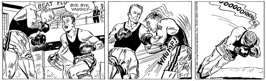 Let’s start with the current Vintage Juliet Jones storyline, in which quiet, submissive Vassily the Exchange Student has been forced to put on the gloves with the Class Bully, and we all saw this result coming and Stan Drake sure dragged it out.