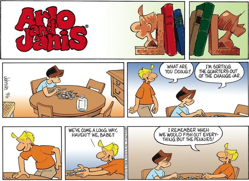 I can remember farther back in a young marriage than Arlo and Janis, because I remember before we even had a change jar, going through sofa cushions and closet floors and scraping together enough change on Friday to buy a quart of Miller’s or some sort of Gallo for our big splurge of the week.