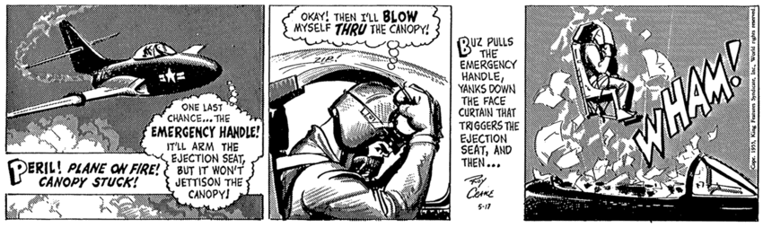 Effective bailing out — as demonstrated by Vintage Buz Sawyer a week ago — required that you be sitting on a wooden board, not pinched in a rubber sling.