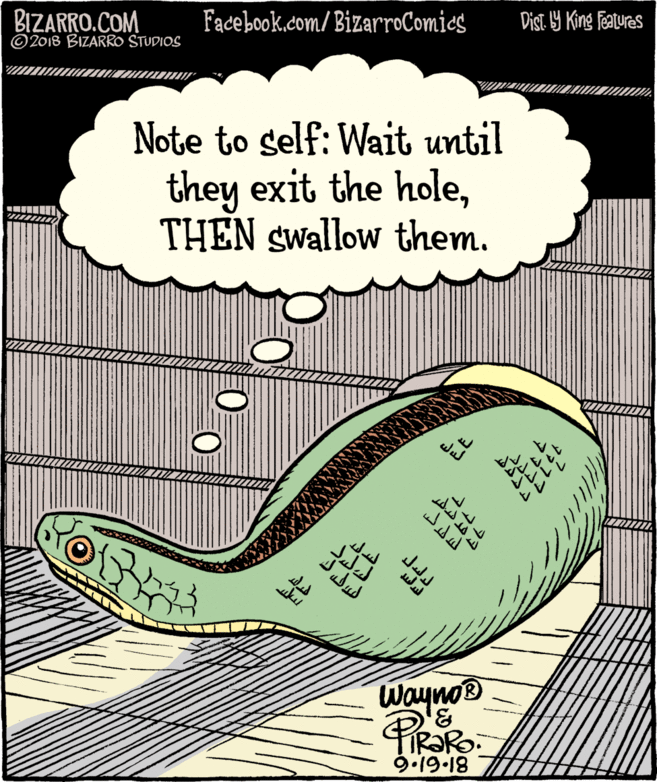 As for the rest of the science, real snakes are not tremendously philosophical and, in a case like this, he’d likely just keep going forward and sleep it off inside the walls.