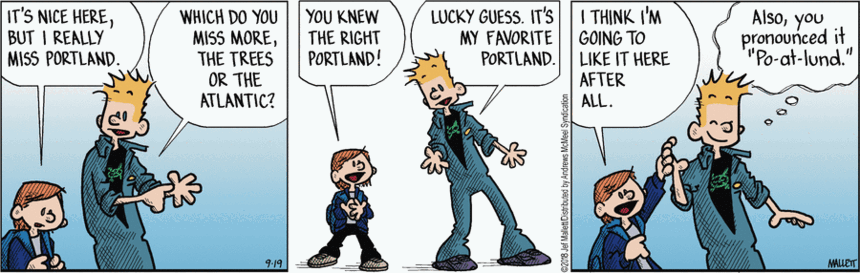 And, speaking of going places, Frazz offers a small salute to the Portland that I identify with, though I don’t speak like a Mainer. I don’t know how necessary that is, given the number of people “from away” who have moved to Portland in the past decade or two.