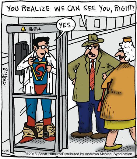 More Humor for Old Folks pops up in today’s Argyle Sweater, because, while we all chuckled at the “no more phone booths” gag in the original and as far as I’m concerned only Superman film, Scott Hilburn is right that the booths didn’t provide much visual privacy, either.