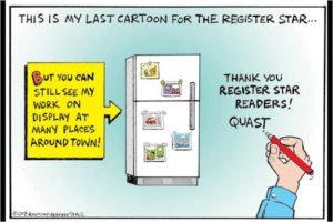 Quast may occasionally produce a political cartoon for the newspaper, but his regular local Sunday cartoon won’t be replaced, said Wally Haas, the Register Star’s opinion editor.