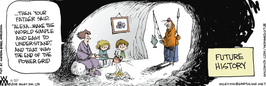 There would be far fewer distractions if today’s Non Sequitur came to life, though, in fairness, shutting off the power grid would only catapult us back about to the 1880s or so. That wouldn’t put us in hunter-gatherer mode but it would certainly simplify our lives, as Wiley suggests.