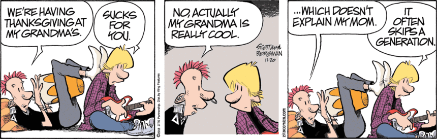 In both strips, a grandparent is cited as having a solid relationship with a kid, and my grandfather, despite being far removed from the Sixties, was strongly supportive of my decision to drop out of college and get my act together.