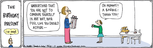 It’s hard to break these conventions, as this 2003 Rhymes With Orange noted, and my take on heroic Disney Princesses and career-Barbies is that a lot of toymakers and film makers are trying to have it both ways, and doing pretty damn well.