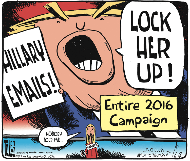 It’s easy enough to aim chants of “Lock Her Up!” at Ivanka, and several cartoonists have, but Tom Toles wins for drilling down to the appalling level of blind, egocentric privilege in which this little girl has lived all her life.