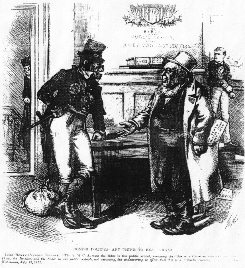 Then I’d bring up this cartoon, in which the Irish monkey person, with a revolutionary pin on his lapel, a bottle in his pocket, a gun in his belt and his I-just-got-here poor immigrant’s possessions in a bandana, dictated to Democratic Candidate Horace Greeley, and Greeley listened, as did the priest around the corner, since those Irish only do what the priest tells them.