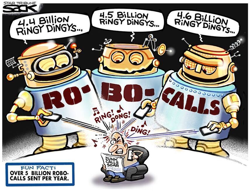 Speaking of cartoonists with changes in their lives, Steve Sack is back on the job, but this cartoon suggests that the time he took off to deal with health issues exposed him to a lot of the garbage calls our cell phones now generate.