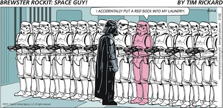 Tim Rickard chose well for this Brewster Rockit gag, because I think, today, only sweaters and wool socks use dyes that are not colorfast. It’s been a long time since I’ve separated colors, though I did learn to keep white socks separate because you end up with little white fuzzies embedded in your dark clothes.