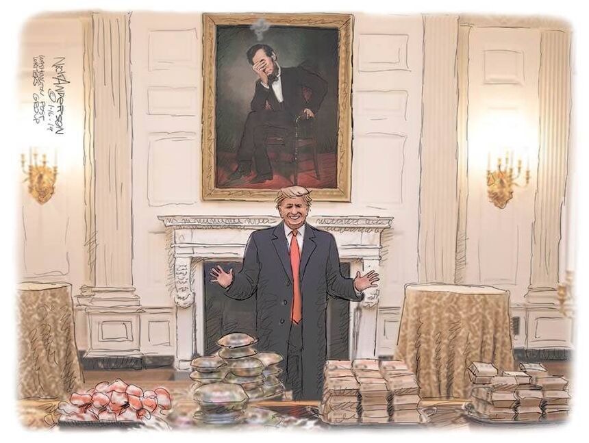 There will be all sorts of cartoons about the event, but I like Nick Anderson‘s take because it’s understated. We’ve got a guy in the office who has no class, and that’s not a rap on the blue-collar people he purports to represent.