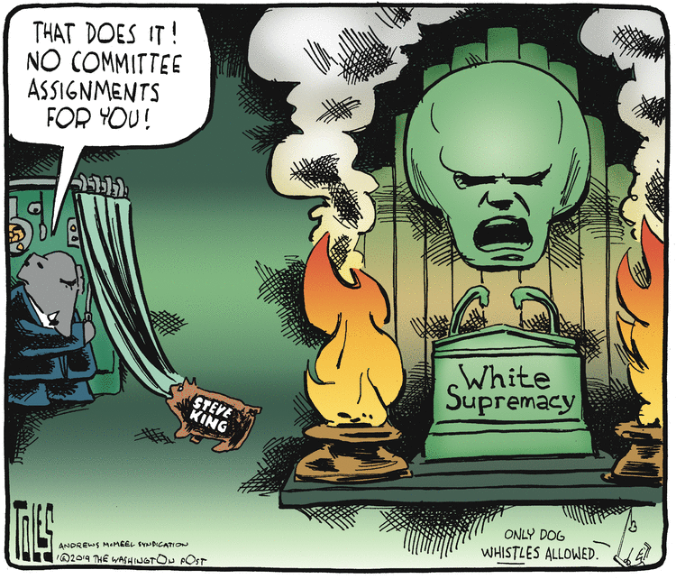 It’s too early to write the final report on Steve King, Iowa’s prehistoric racist representative, though Tom Toles draws a nice, if familiar, parallel to undercut the Republican response.