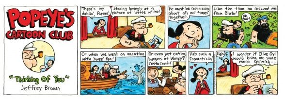 Jeffrey Brown offers a more classic take on Popeye’s relationship when Olive Oyl catches him gazing wistfully at a photograph of her. She assumes he’s remembering good times, but the final panel reveals the truth. Popeye thinks, “I wonder if Olive Oyl would bring me some more spinnich.”