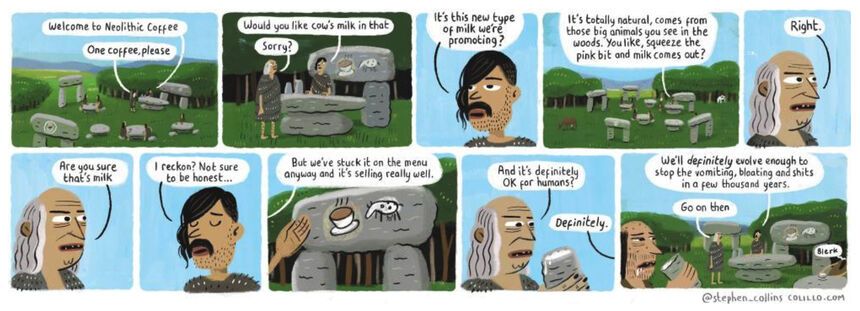 As it happens, I recently came across reports that, back about the time in Collins’ cartoon, ancient proto-Europeans were making cheese/yoghurt kinds of fermented food, which would create a sort of bridge towards, as the caveman/barista suggests, evolving to the point of being able to digest the stuff raw.