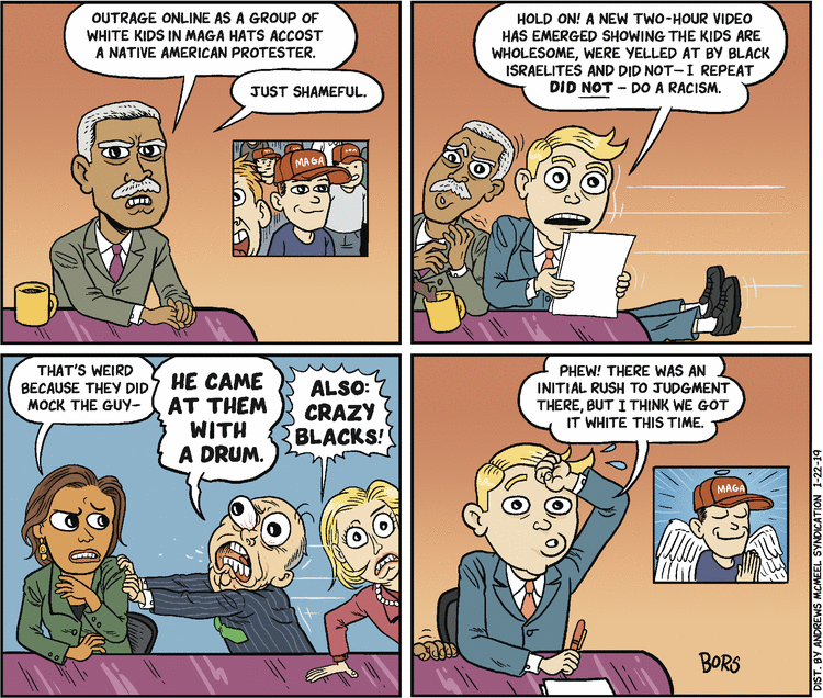 Matt Bors reflects the battle now raging over whatever happened at the Lincoln Memorial, which seems at this point to be outrage over young people being used as political pawns, which seems to involve using the young people as political pawns.