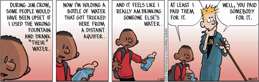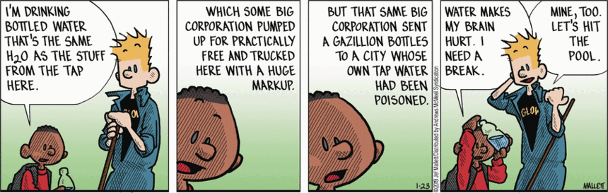 Frazz is in the middle of a story arc about bottled water, and, fortunately, is finding it more complex than the usual ecoplatitudes. These are the two most recent strips.