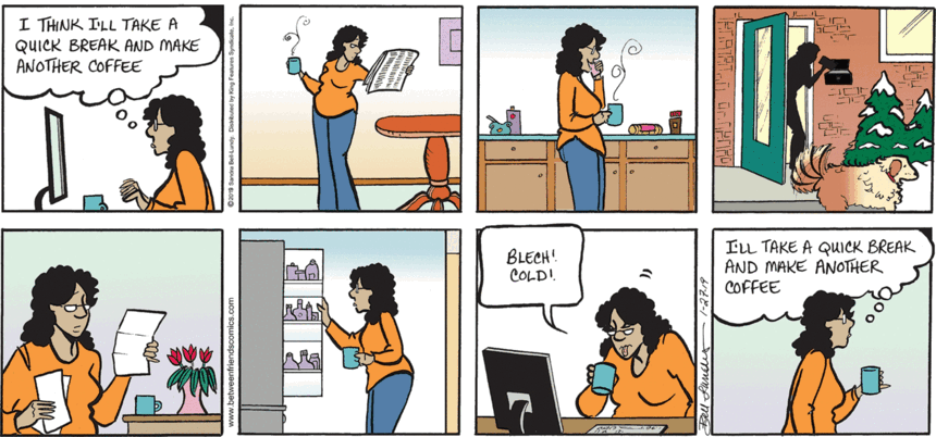 I can’t say how it works for cartoonists, but today’s Between Friends certainly depicts how it works for writers, except that I do get through my morning coffee while it’s hot.