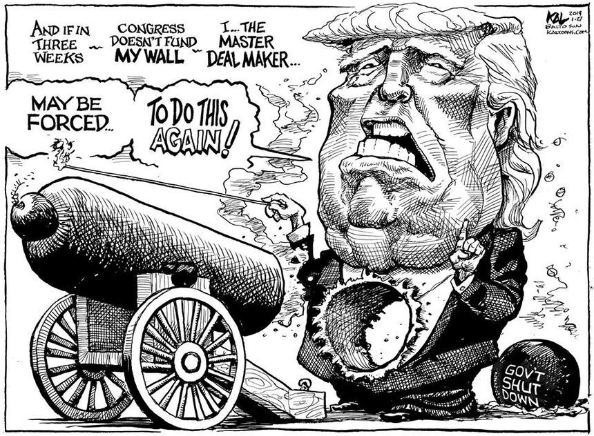 Skip to commentsKal Kallaugher pretty much encapsulates the political situation, at least for the next few hours. A lot of good shutdown cartoons have become irrelevant, and there’s some question as to whether they will spring to life again in three weeks.